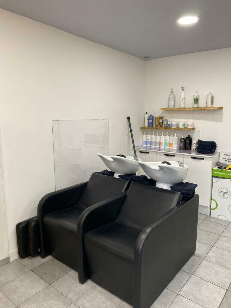 Carrelage gris dominant, murs blancs sans personnalité, plafond bleu-gris refroidissant la pièce. La zone bac manquait d’intimité et la zone boutique n’était pas clairement identifiable pour les clients. L’ensemble était pratique, mais l’atmosphère ne vibrait pas encore.
