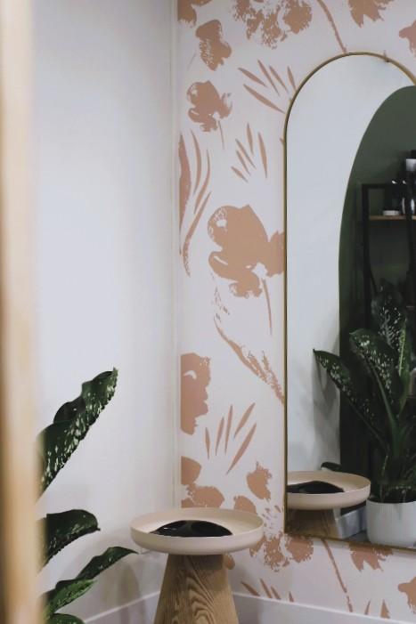 Le comptoir a été réchauffé par une teinte plus chaleureuse, et le coin coiffage s’est transformé en espace signature grâce au papier peint fleuri et au miroir pleine hauteur.